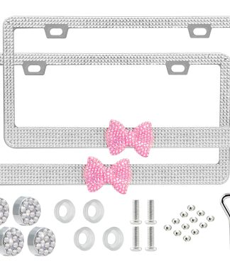 Xylobyte Bling License Plate Frame for Women, 2 Pack Sparkly Diamond Car Tag Covers with Rhinestone Crystals & Glitter Screw Caps, Stainless Steel Girly Auto Accessories, for Her (White + Pink Bow)